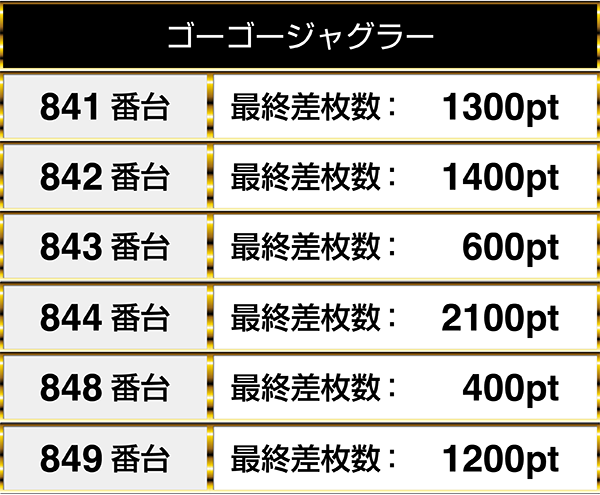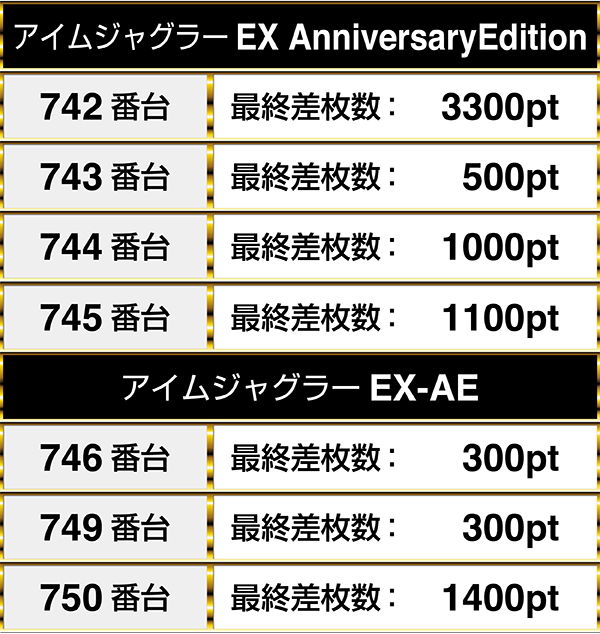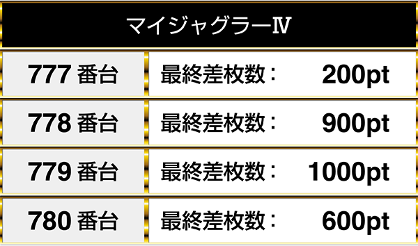『ゴーゴージャグラー』と『アイムジャグラーEX AnniversaryEdition』、『マイジャグラーⅣ』の3機種には、4台が並んでプラスptとなっているデータがあった。
