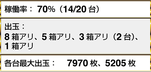 ホールには大勢のプレイヤーが来店しており、さまざまな機種が盛況。機種のポテンシャルを最大限に引き出せているような姿があちこちでみられるなど、多くの場所から活気が感じられた。