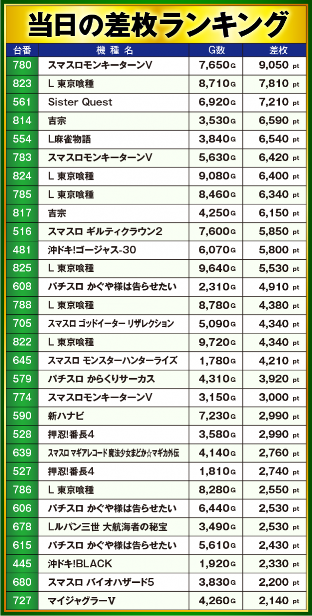レポートの最後に「Super D’STATIONガーデン前橋店」の差枚ランキングも掲載!