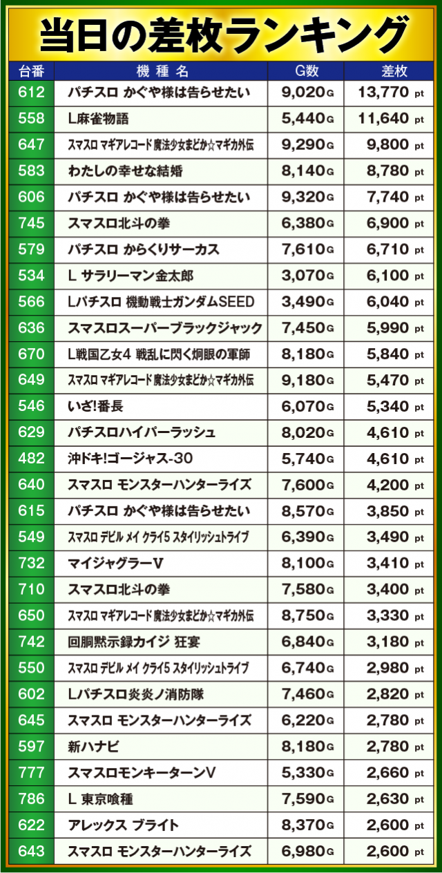 レポートの最後に「Super D’STATIONガーデン前橋店」の差枚ランキングも掲載!