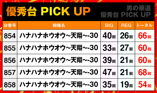 「ハナハナホウオウ~天翔~-30」は5台が設置されており、854番台と857番台のボーナス回数が60回超!