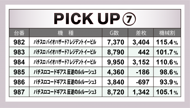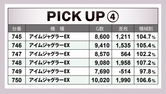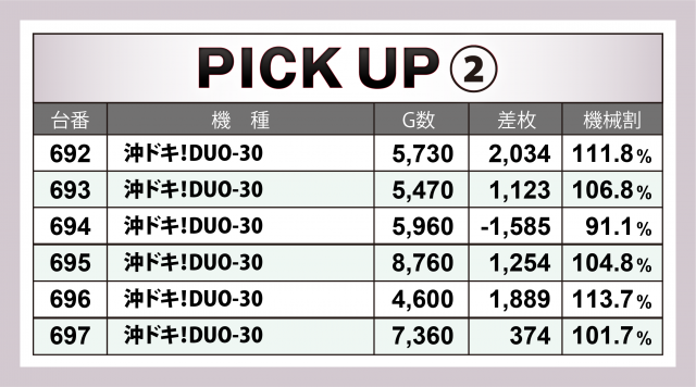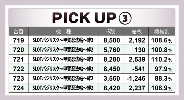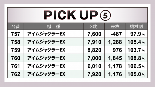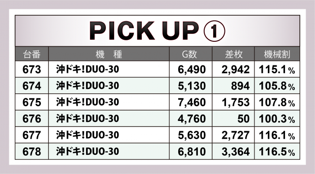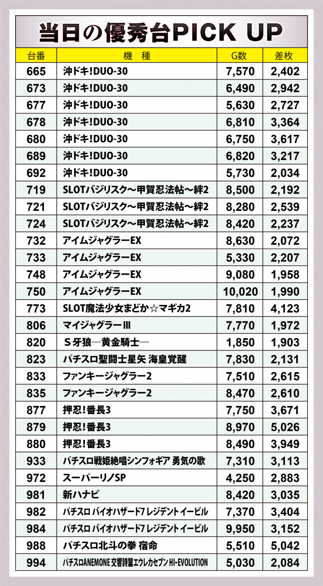 まずは当日の優秀30台のPICK UPから。後述する横並び好況スポット以外では『押忍!番長3』のプラス差枚数が光り、3台で+1万2千枚超を記録! その他でも4千~5千枚クラスの台も散見された。