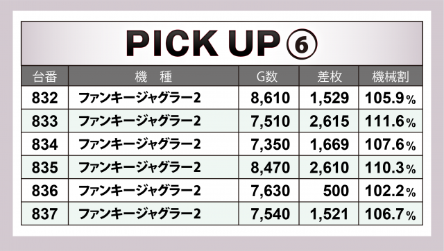 この日は横並び好況スポットが6機種7か所も出現。各所で好成績を残す中、『ファンキージャグラー2』は6台全てがプラスと安定の結果、トータル差枚数+1万枚を記録した。