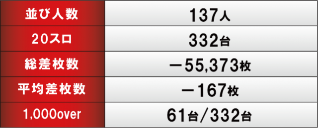 さて、超久々に『マルハン伊勢崎店』で実施された「英雄の軌跡~ヒーローズレポート~」だが、結果は総差枚数-55,373枚で惨敗となってしまった。優秀台は数多くあるのはさきほどもご紹介した通り。言ってしまえば優秀台よりもマイナスとなった台が圧倒的に多かったということになる。これで2連敗となってしまったが、こうなれば3連敗だけは絶対避けたいと言ったところ。そう願いつつ次回実施の時を待とう。