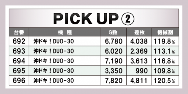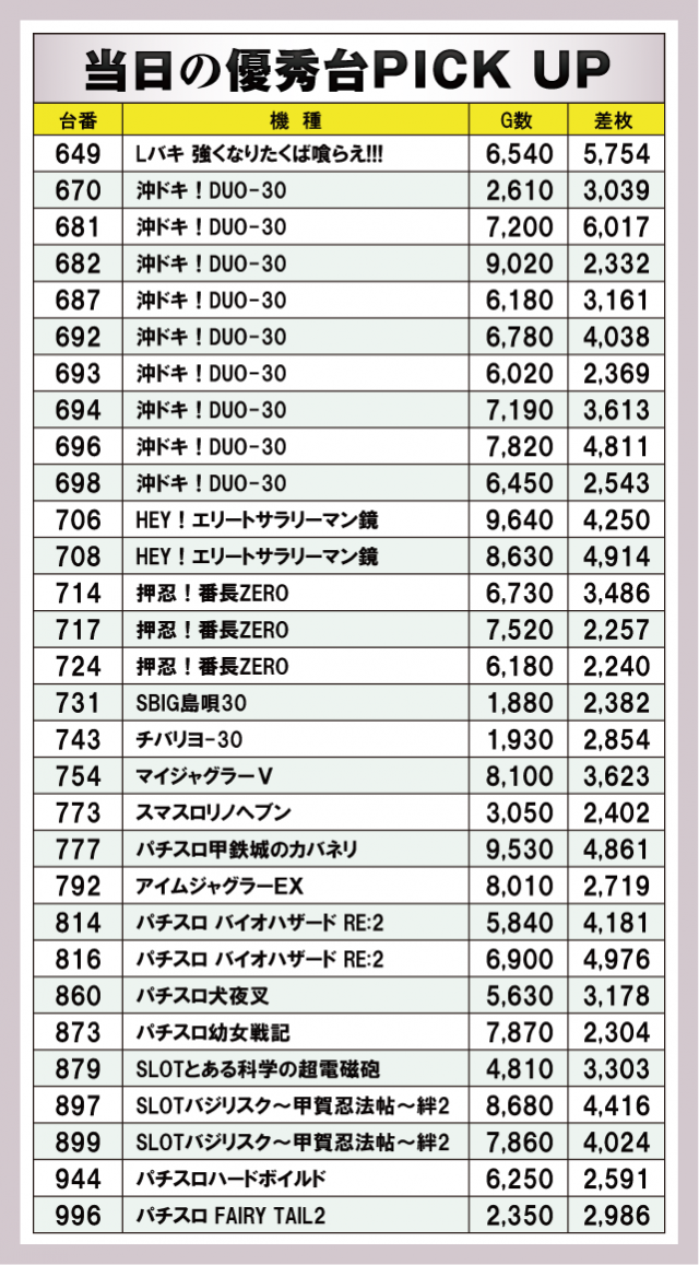 さて、今回の優秀台の面々はこちら。ザッと見ると『沖ドキ!DUO-30』の優秀台が多いのが分かる。ここに挙がっているだけで9台! しかも3000枚・4000枚級が複数台あり、30Φだけにドル箱の数が多くなるので、出玉感もかなりあったのではないかと思われる。その他、注目のスマスロや6.5号機にも高設定と思わしき差枚数の台が散見された。