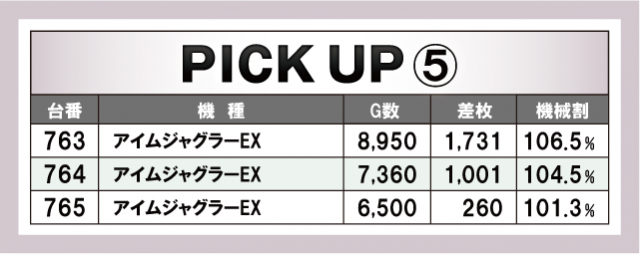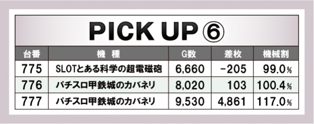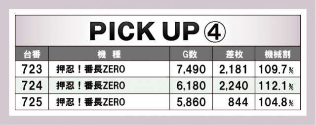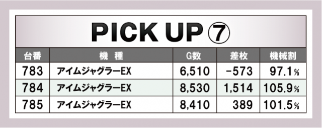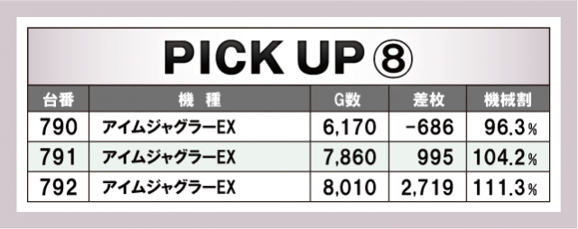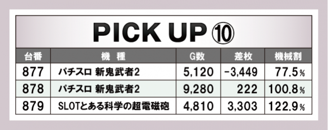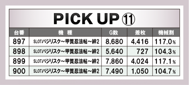 今回の「英雄」のピックアップはなんと11箇所。さきほどご紹介した優秀台の面々と被っている台もあるが、並びではどうだったのかを厳選してお届けしている。ゲーム数や差枚数だけでなく、機械割も掲載しているのでどの台がどれくらいの結果だったのかチェックしておこう。