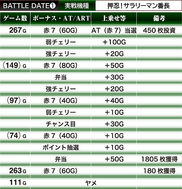 弱チェリーや弁当で上乗せできたことも大きな助けとなり、朝イチの出だしから投資450枚の低投資で出玉1805枚を獲得。