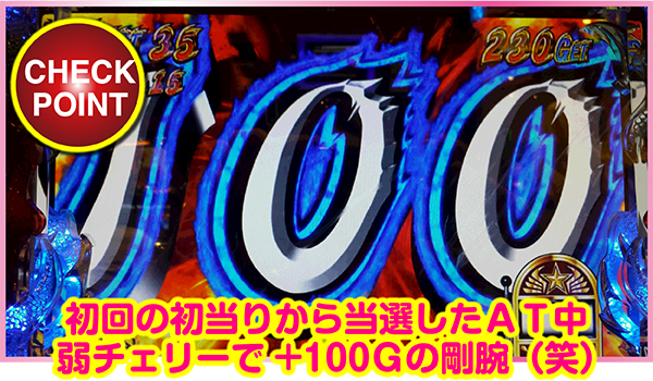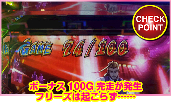 ボーナス中、70Gの表示が出たりして「6確定!?」なんて思っていたら、そのまま+30Gとなりボーナス100G完走へ。わくわくの展開だったけれど、1/3を引くことはできずフリーズは不発。けれど、見せ所は満載だったと満足しています。