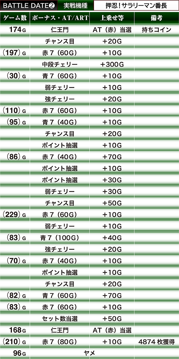約1000Gほど、ATを消化。このAT中もモード移行が良く、天国に上がるし、天国ループもしてくれた優秀台。ATを抜けるも、すぐに仁王門でまたAT当選したり、2台目の番長では4874枚獲得しました。