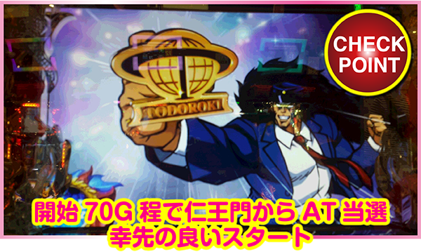 だが、そのゲーム数では残念ながらボーナス当選せず……。しかし、すぐに仁王門に突入し、そこでの解除からのAT当選に成功!! その間、わずか70G。前半戦と同じく、好スタート!!