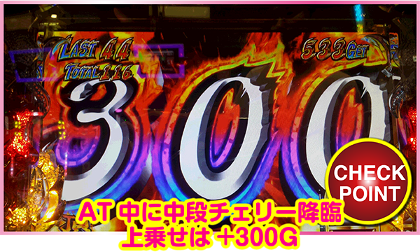 ただ、やはりATゲーム数は50Gなので、この間で何かアクションを…と。チャンス目後、197Gでボーナス(赤7)当選しつつ、「何とか駆け抜けは防げた」と思っていた時、素敵過ぎる贈り物……AT中、夢にも見た中段チェリー降臨。AT中の中段チェリーの上乗せ振分けは、+100G→50%、+200G→25%、+300G→25%。ドキドキの結果は……最高の25%!! +300Gである!!