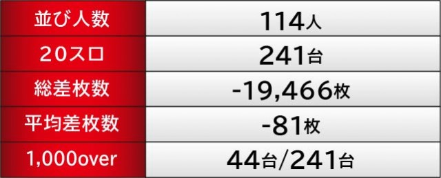 全20台設置されている『アイムジャグラーEX』は、いずれも朝からじっくりと打ち込まれていた。大きなマイナスを記録している台も少なく、全台が相当な手ごたえを感じられたのではないだろうか。3~4千枚OVERが発生している点からも、各所でコンスタントにGOGOランプが光り輝いていた光景を容易に想像できるだろう。