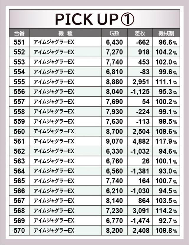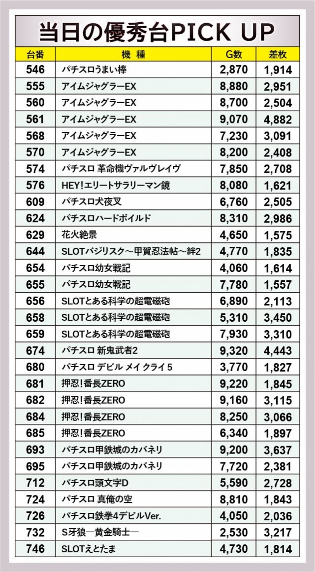 ピックアップされた優秀台をチェックすると、機種単位での活躍が窺えるだろう。その中で『アイムジャグラーEX』は561番台+4,882枚や568番台+3,091枚といった記録を打ち立てている。また『SLOTとある科学の超電磁砲』も658番台+3,450枚・659番台+3,310枚と、横並びで熱気を放っていたのも見逃せない。