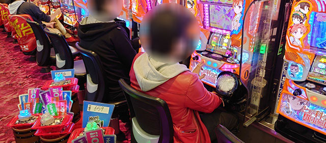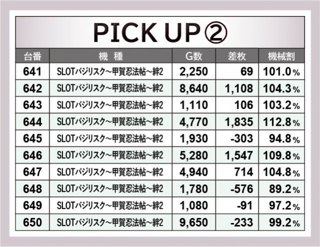 また『SLOTバジリスク~甲賀忍法帖~絆2』全10台も、閉店まで粘り強く戦っていた形跡が見られる。残念ながら全台が多くのゲーム数を消化されたわけではないが、差枚数から鑑みるに、やはりこちらも手ごたえを感じられたエリアに違いない。対照的な結果となっており、ファン各々がしっかりとレバーを叩いていれば、もっと違った景色が広がっていたのは間違い。