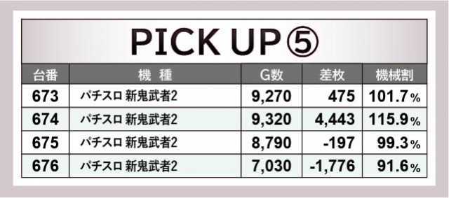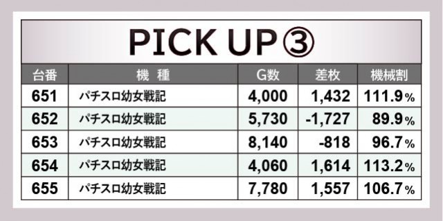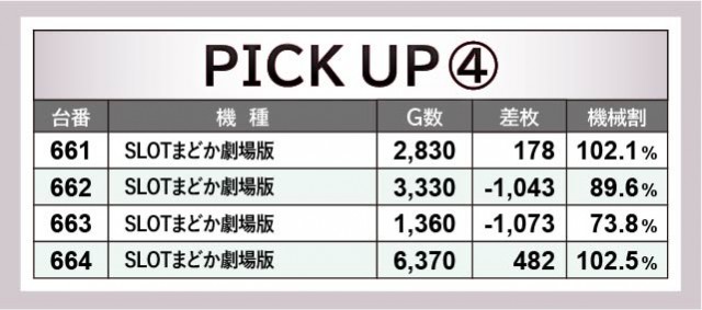 『パチスロ幼女戦記』『パチスロ 新鬼武者2』『押忍!番長ZERO』のデータを覗いてみよう。674番台+4,443枚や682番台+3,115枚、684番台+3,066枚といった記録が見られる。消化されたゲーム数を見ても、やはり全台からポテンシャルを感じ取れたのは確かだ。『SLOT劇場版 魔法少女まどか☆マギカ[前編]始まりの物語/[後編]永遠の物語』こそ消化不良に終わっているが、こちらにもチャンスが眠っていたことを考えると、勿体ない状況だったのは否めない。