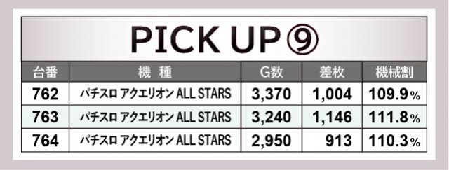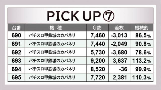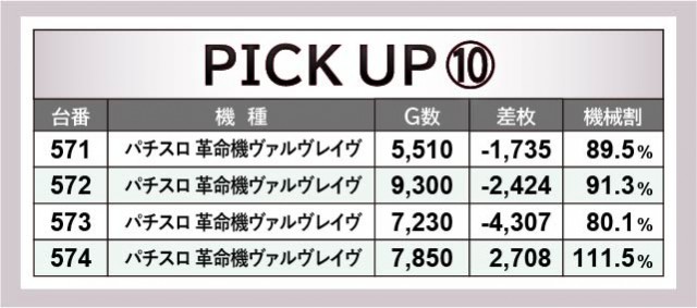 最後にスマスロの様子をお伝えしよう。『パチスロ 革命機ヴァルヴレイヴ』『HEY!エリートサラリーマン鏡』ともに不発で終了しているが、やはり回転数から手ごたえの有無が見えてくる。今後のパチスロ業界を牽引する存在であるため、次回以降での奮起に期待したいところだ。後者は回転数・差枚数が比例して右肩上がりにグラフを描く台もあり、これからの両台からは目が離せなさそうだ…!