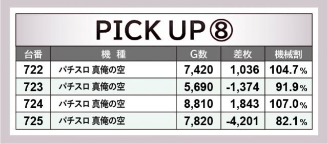 『パチスロ甲鉄城のカバネリ』は693番台+3,637枚・695番台+2,381枚という記録を残し、『パチスロ アクエリオン ALL STARS』全3台はプラス差枚を達成。両機種とも登場から根強い人気を誇っており、この日もファンに納得のパフォーマンスを披露していたことだろう。新台『パチスロ 真俺の空』は不発に終わってしまったが、しっかりと粘り強く戦っていた形跡があり、ファンが可能性を感じ取っていた様子が分かる。