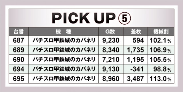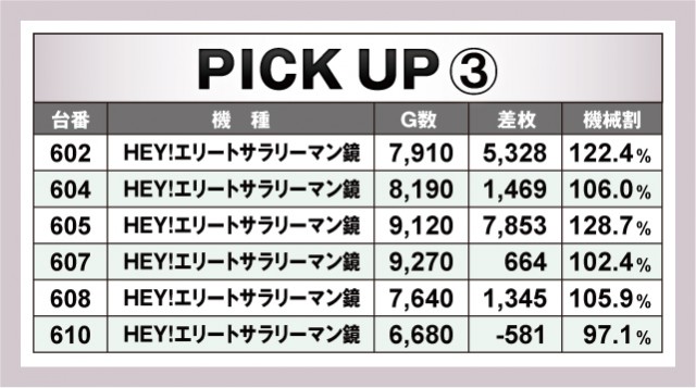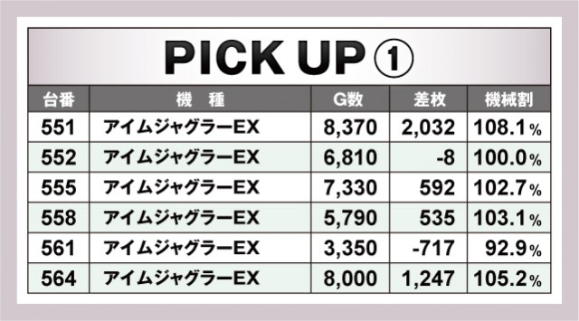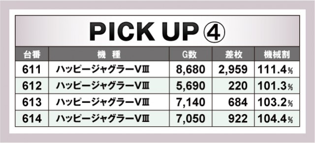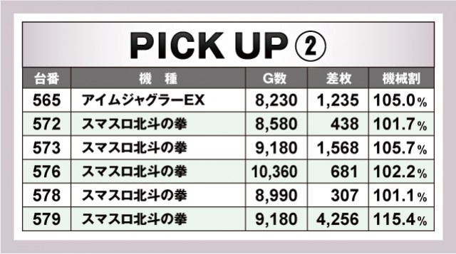 今回のピックアップは5箇所。稼働がついた人気どころの機種がピックアップされている。総ゲーム数、差枚数、機械割が記載されているので気になる台があればチェックしておいて欲しい。