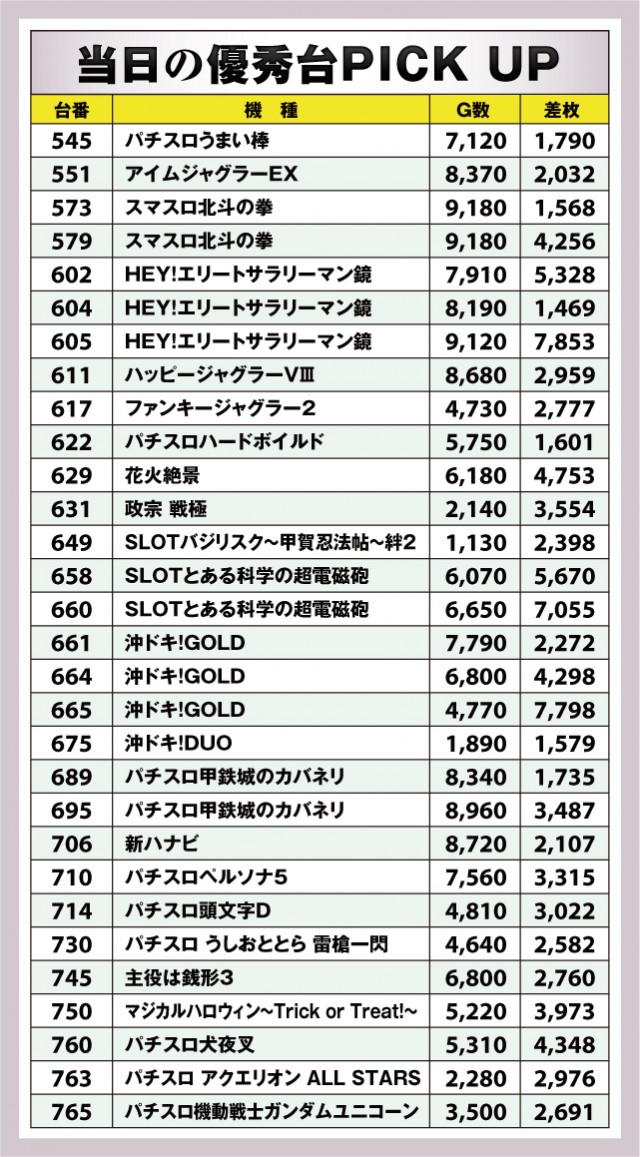 さて、早速だが今回の優秀台をチェックしていこう。ザっと見た感じ、どの機種に偏るわけでもなく、万遍なく優秀台が輩出されているのが分かる。トップ差枚数は『HEY!エリートサラリーマン鏡』の605番台から7,853枚。『スマスロ北斗の拳』もデビューし、スマスロのシマがまた活気を取り戻しているようだ。2番手は『沖ドキ!GOLD』の665番台から7,798枚、3番手が『SLOTとある科学の超電磁砲』の660番台から7,055枚となり、トップ3が僅差でひしめく状況となった。やはり6.5号機勢も侮れないといった感じだ。
