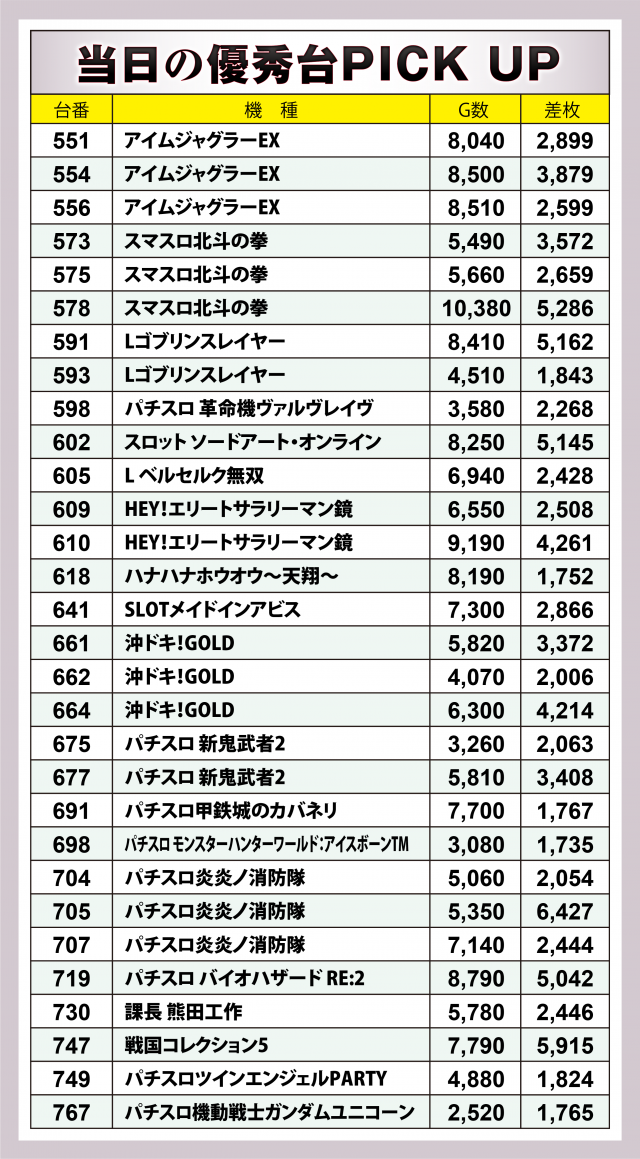 後述する計13機種の好調並び以外では、+6千4百枚を突破した『パチスロ炎炎ノ消防隊』、+6千枚到達目前の『戦国コレクション5』、いずれも+5千枚オーバーの『スロット ソードアート・オンライン』『パチスロ バイオハザード RE:2』、+4千枚超を含む2台合計で+7千枚弱を記録した『HEY!エリートサラリーマン鏡』といったマシンの成績が光った。