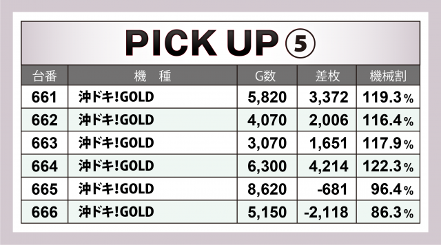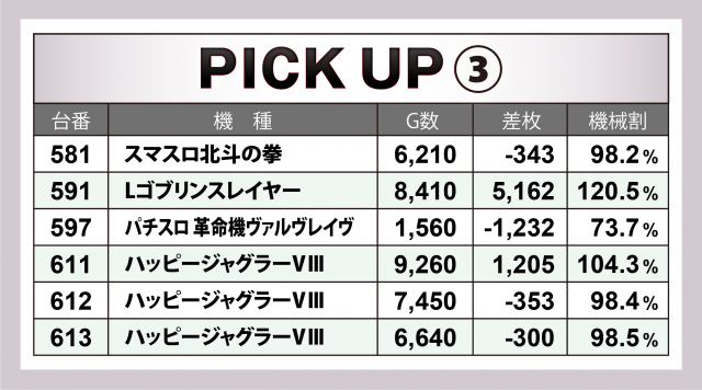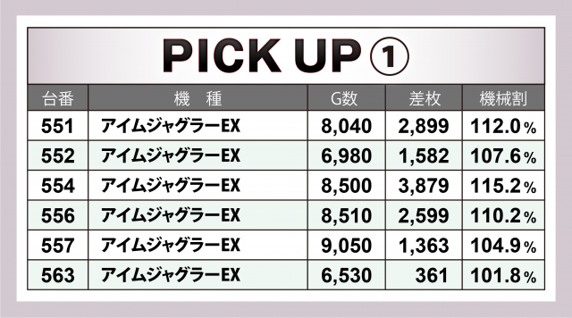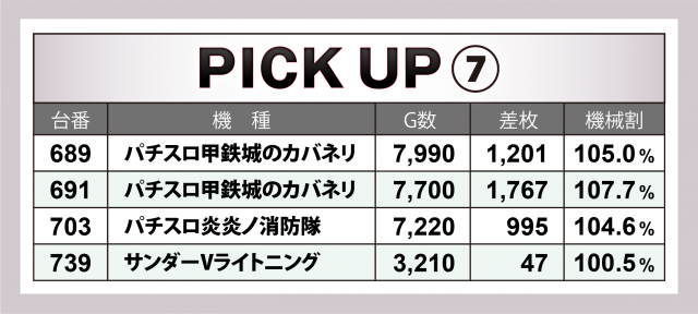 まずは優秀30台のPICK UPをチェック。30台のうち8割となる24台が差枚数+2千枚以上を達成、+3千枚以上は全体の4割となる12台、+6千枚オーバーは3台となった。
