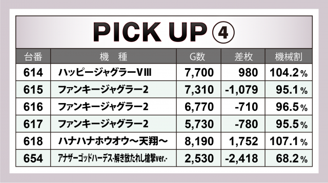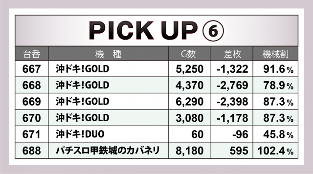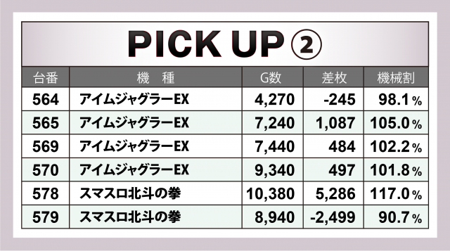 内容が悪くなかっただけに、全台の最終差枚数だけが物足りなかったのが悔やまれる。次回取材では前回にも負けない数値を弾き出して、リベンジを果たしてもらいたいものだ。