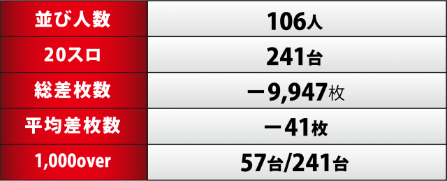 今回の取材において[1000円/47枚]スロ241台トータルではマイナスを喫し、前回の圧倒的なプラス差枚数に比べると残念な結果となってしまった。一方で1,000overは前回よりも20台弱減らしたものの全体の4分の1弱となり、他店取材と比較しても高水準をキープした。
