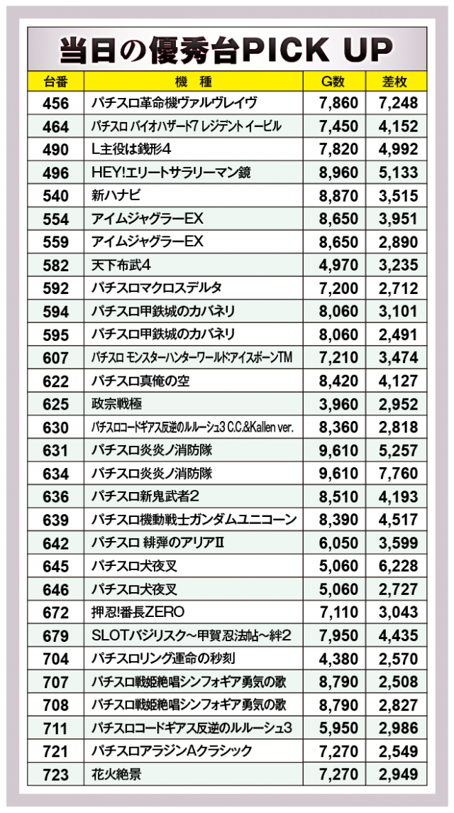まずは優秀30台PICK UPから。30台全てが差枚数+2千枚以上を達成、+3千枚オーバーは18台、+4千枚オーバーは11台、+5千枚オーバーは5台となった。後述する好調機種以外では、634番台の『パチスロ炎炎ノ消防隊』が+7,760枚でこの日のトップ差枚数をマークした。次いで、456番台の『パチスロ革命機ヴァルヴレイヴ』で+7,248枚、さらに645番台の『パチスロ犬夜叉』で+6,228枚をマークし、様々な機種の活躍が目立っていた。