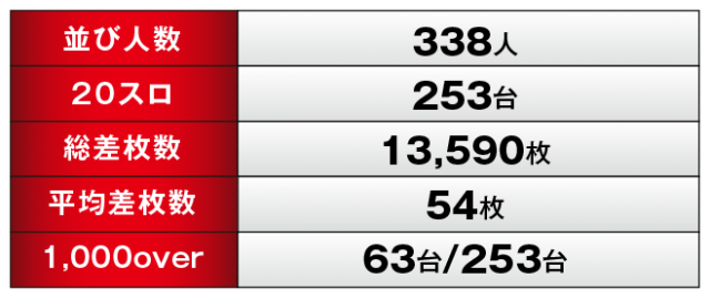 優秀台・ピックアップ機種の活躍もあって、この日の総差枚数は+13,590枚という結果により、見事デビュー戦を白星で飾ることができた。また1000over台も全体の1/4強と高い水準をマークし、各機種がしっかりと結果を残したことで同店としては緊張が一気にほぐれたはずだ。またファンとしても、同店の実力を目の当たりにして虜になったかもしれない。引き続き情報や動向に注視しつつ、同店の躍進に期待したいばかりだ。