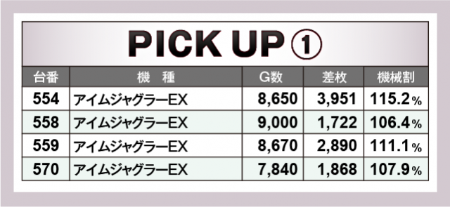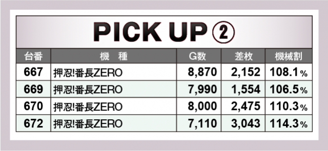 続いては、この日の好調機種2機種をチェック。まず、『アイムジャグラーEX』では、554番台の+3,951枚を筆頭に4台のトータル差枚数は+1万枚オーバーを記録。また、『押忍!番長ZERO』では672番台の+3,043枚を筆頭に4台のトータル差枚数は+9千枚オーバーをマークした。