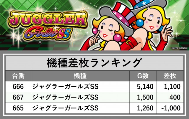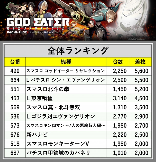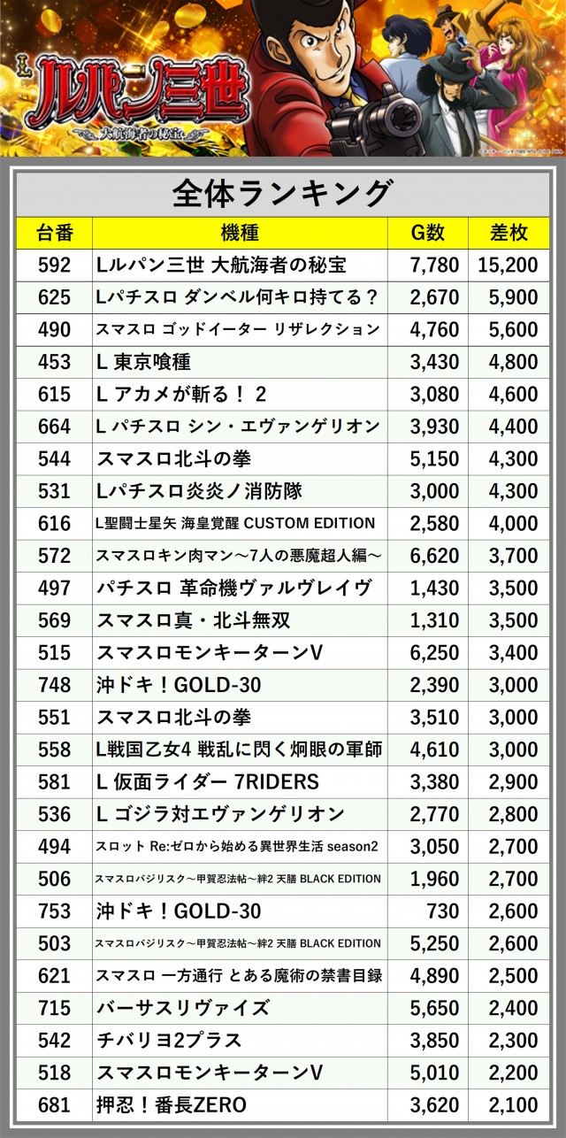 厳選された取材対象機種をはじめ、その他スロット全体から好記録が飛び出した!プレイヤーが楽しんだ1日を下記データにて振り返ってみて欲しい。