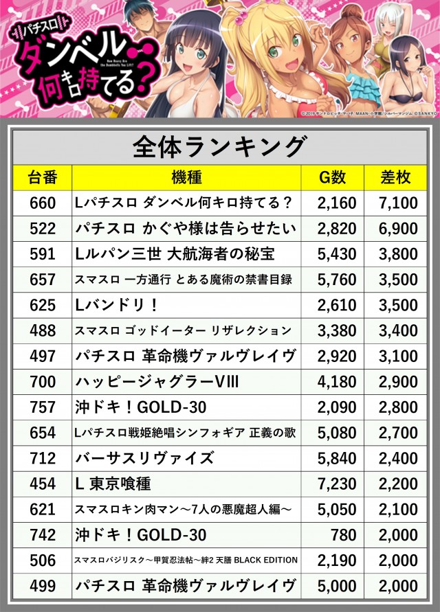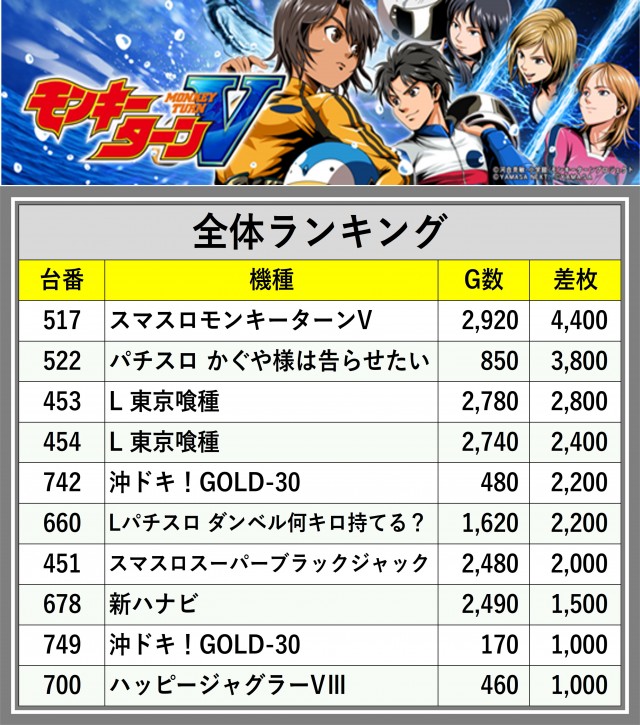 厳選された取材対象機種をはじめ、その他スロット全体から好記録が飛び出した!プレイヤーが楽しんだ1日を下記データにて振り返ってみて欲しい。