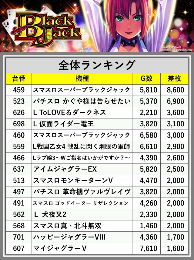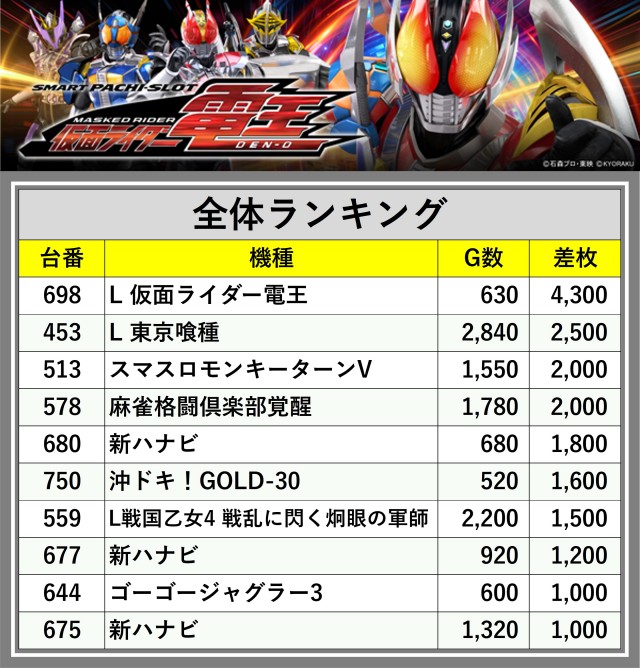 厳選された取材対象機種をはじめ、その他スロット全体から好記録が飛び出した!プレイヤーが楽しんだ1日を下記データにて振り返ってみて欲しい。