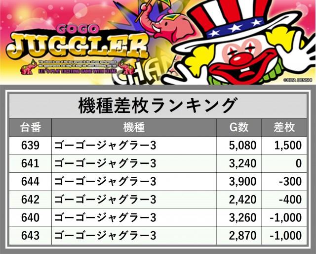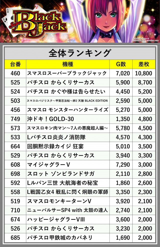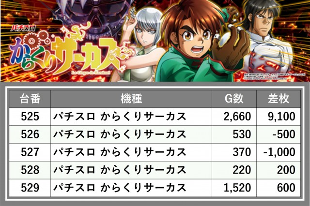 厳選された取材対象機種をはじめ、その他スロット全体から好記録が飛び出した!プレイヤーが楽しんだ1日を下記データにて振り返ってみて欲しい。