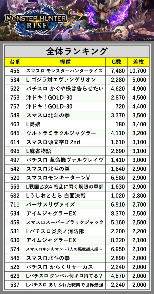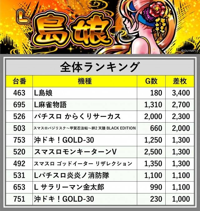 厳選された取材対象機種をはじめ、その他スロット全体から好記録が飛び出した!プレイヤーが楽しんだ1日を下記データにて振り返ってみて欲しい。