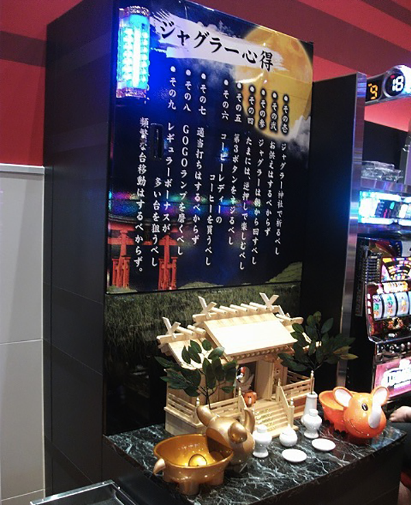 パチスロコーナーには、ジャグラーの心得が書かれたジャグラー神社を発見。遊技以外の部分でも楽しんでもらいたいといったホールの思いが感じられた。