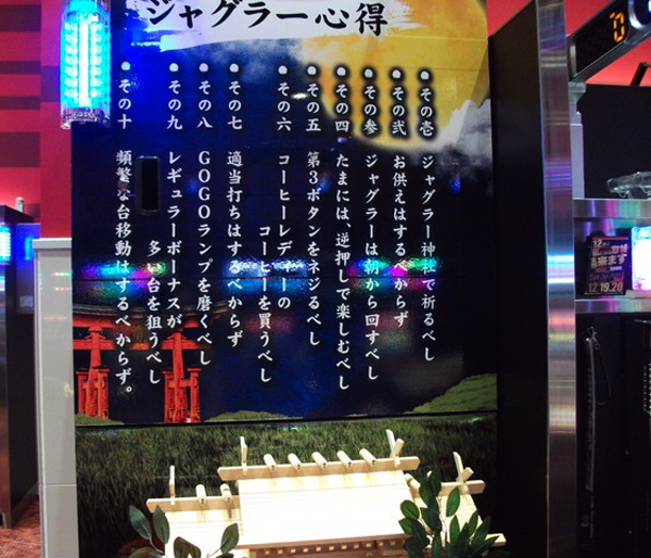 「SLOT魔法少女まどか☆マギカ」やジャグラーシリーズなどもにぎわっており、楽しそうに遊技をするプレイヤーが多数。また、全10項目ある「ジャグラーの心得」や「ジャグラー神社」いった面白い要素が用意されていることも魅力的に映った。