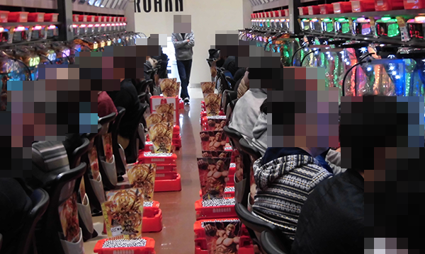午後になっても、4円パチンコの「ぱちんこCR真・北斗無双」に空き台はほとんどみられない。