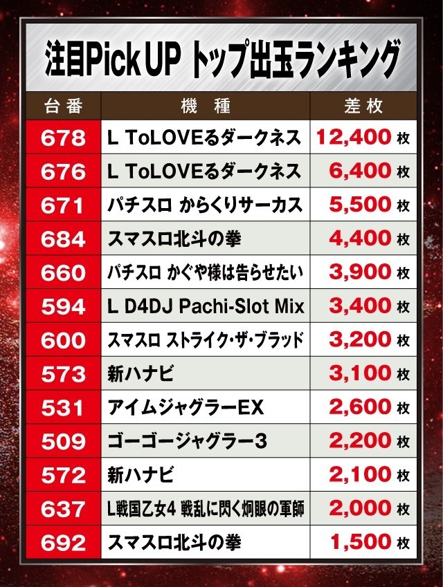 この日、最も活気に満ち溢れていたのが『L ToLOVEるダークネス』で、678番台が万枚超の+12,400枚、676番台が+6,400枚を記録、出玉ランキングにおいてワン・ツーフィニッシュを決めているだけにファンとしては大満足だったに違いない。