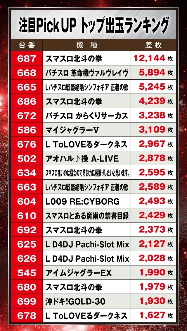 この日、最もプレイヤーの注目を集めていたのが『スマスロ北斗の拳』で、ランキングトップになった687番台の+12,144枚をはじめ686番台が+4,000枚超、692番台が+2,000枚超と複数の台が見事な結果を残している。