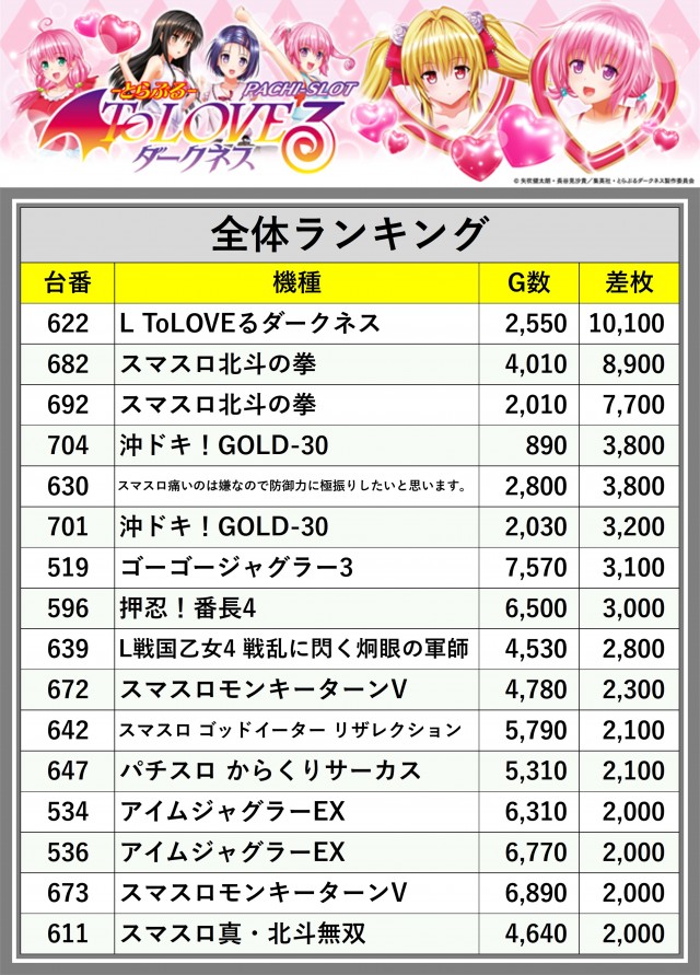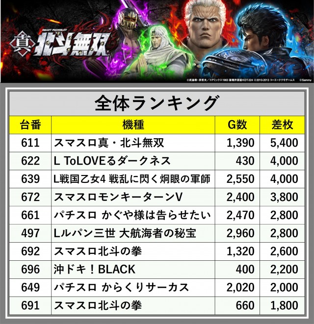 厳選された取材対象機種をはじめ、その他スロット全体から好記録が飛び出した!プレイヤーが楽しんだ1日を下記データにて振り返ってみて欲しい。