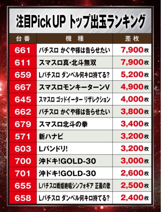 また、その他の機種では『Lパチスロ ダンベル何キロ持てる?』で+5,200枚、『スマスロモンキーターンV』と『スマスロ ゴッドイーター リザレクション』で+4,000枚超と、様々な機種が好成績を残している。