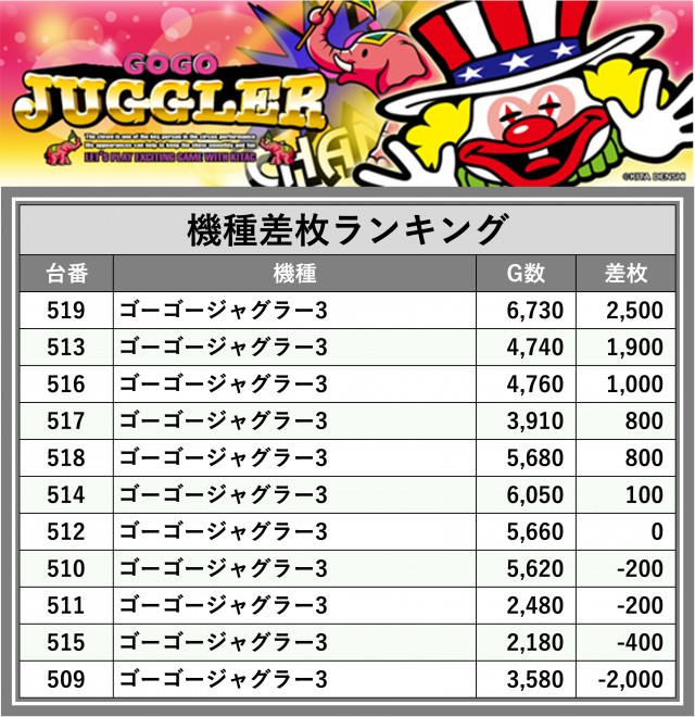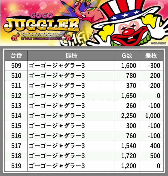 厳選された取材対象機種をはじめ、その他スロット全体から好記録が飛び出した!プレイヤーが楽しんだ1日を下記データにて振り返ってみて欲しい。