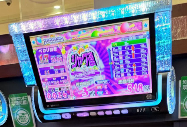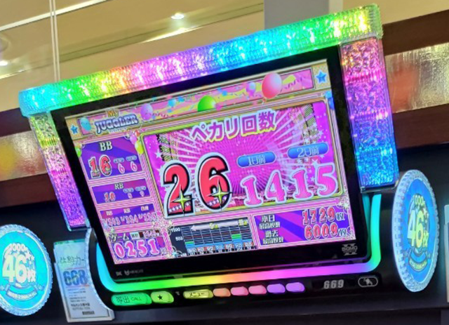 『ゴーゴージャグラー2』では、3591Gを消化した時点で28回のボーナスに当選している台を確認。