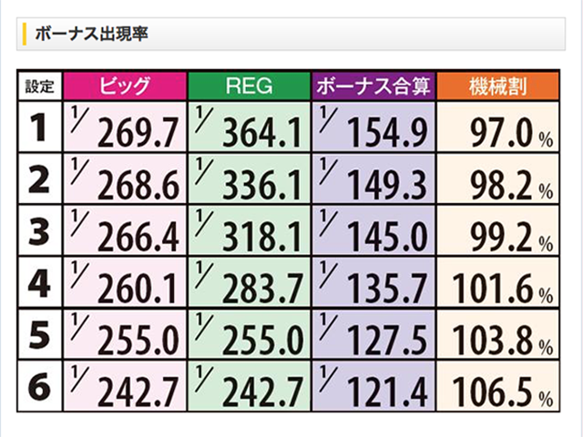 設定推測において重要となるのがREG確率。BIGをあわせたボーナス合算確率もしっかりと確認しておこう。