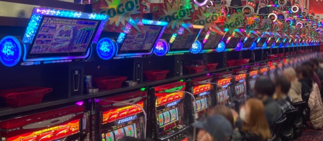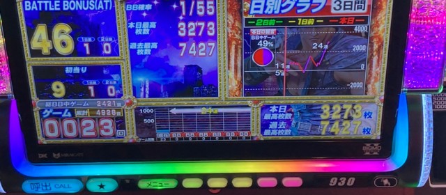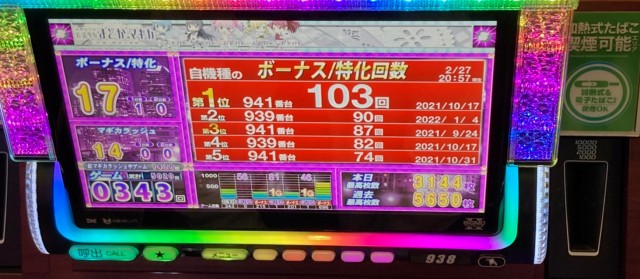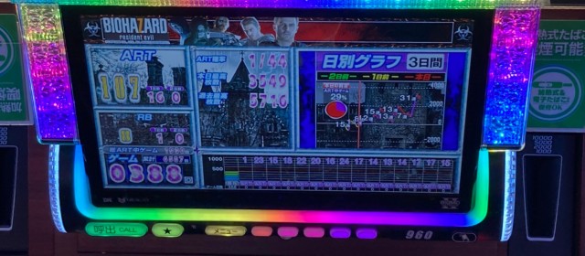 ではこの日の[1,000円/46枚] スロの優秀30台PICK UPから。後述する横並び好況スポット以外では『S聖闘士星矢 冥王復活』『パチスロ北斗の拳 宿命』『パチスロ バイオハザード7 レジデント イービル』が差枚数+3千枚クラス、その他の機種でも台上ボーナス表示の多さやドル箱使用台が数々目についた。