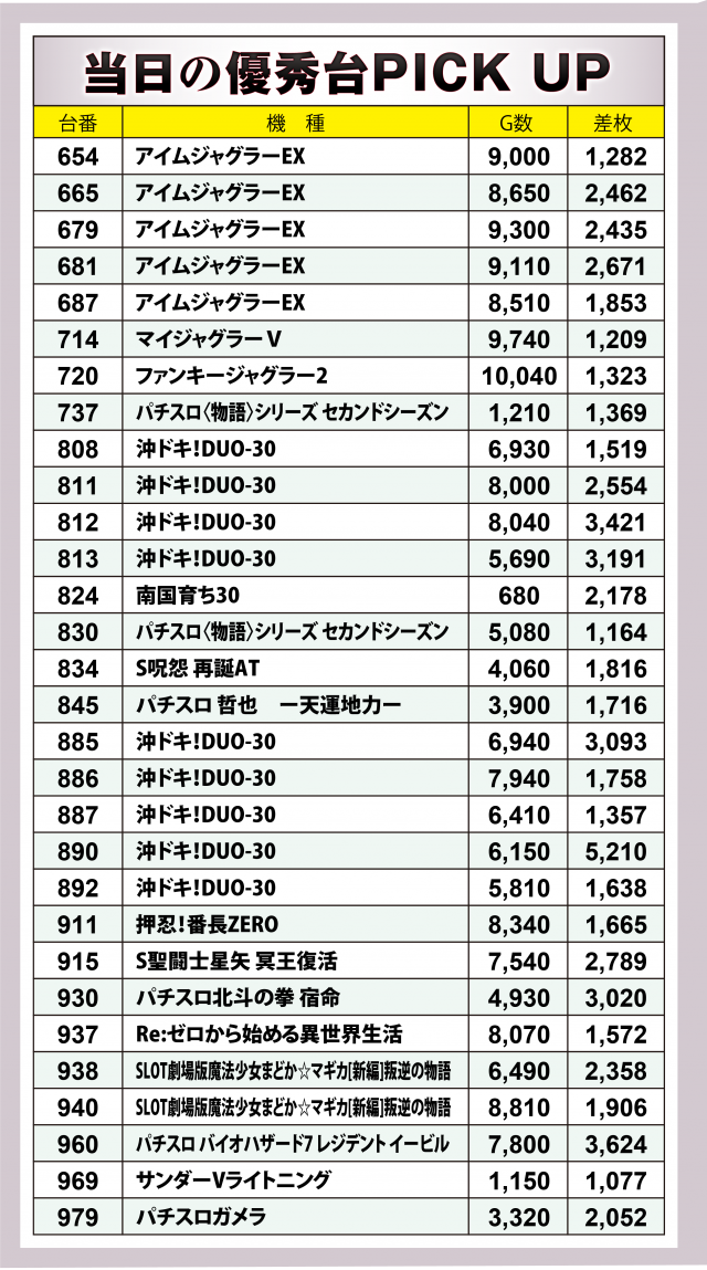 今回、[1,000円/46枚]スロでは全台トータルでマイナスに終わってしまった。だが優秀30台PICK UPの表から見るとお分かりの通り、中にはゲーム数が少ない台が複数あり、こちらをもっと打ち込めば最終の合計結果は変わっていたかもしれない。「英雄」取材に挑む勇者たちには、粘り強く戦い続ける姿勢を貫いてもらいたい。