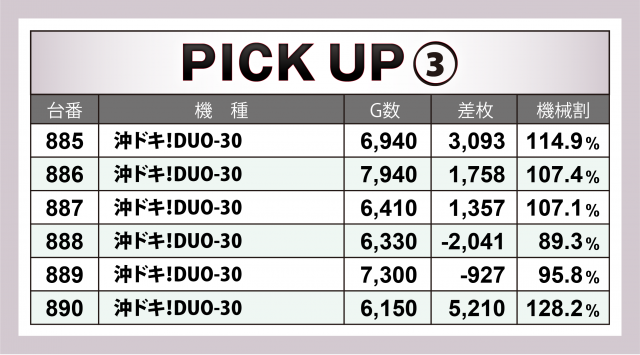また、この日は3機種4か所の横並び好況スポットが出現。それぞれプラス台の占める割合は高く、差枚数+3千~2千枚クラスの台が頻発。中でも好成績だったのが『沖ドキ!DUO-30』。+5千枚の台を筆頭に10台合計で1万5千枚を達成!