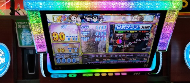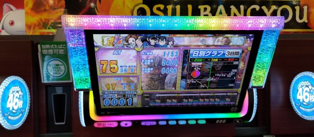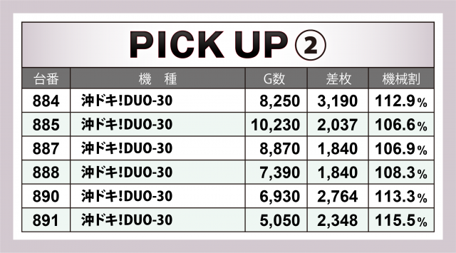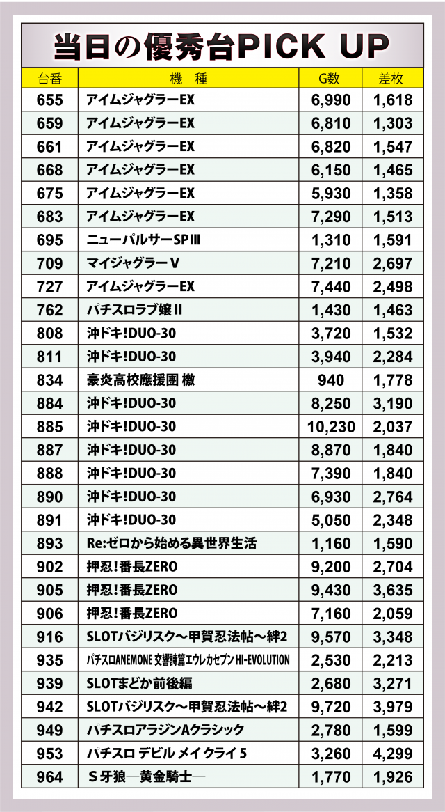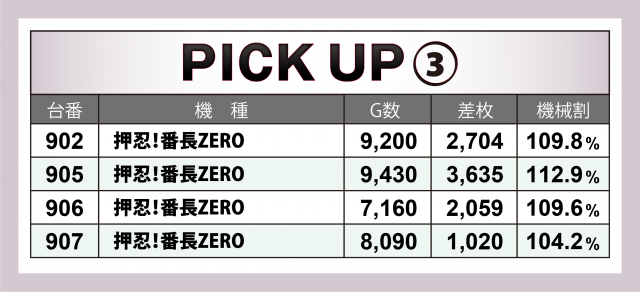 続いては当日の好調3機種について。差枚数の高さで秀でたのが『沖ドキ!DUO-30』で、+3千枚台を筆頭に6台合計で+1万4千枚弱を達成。さらに『押忍!番長ZERO』は+3千6百枚を記録した台をトップに4台トータルで+1万枚目前となった。