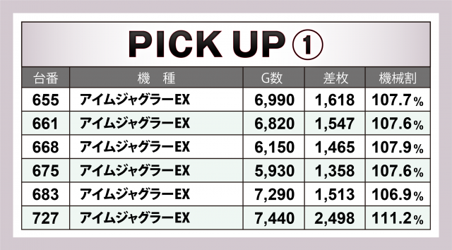 まずは優秀30台PICK UPをチェック。差枚数+3千枚以上が6台となり、後述する好調3機種にも含まれる『アイムジャグラーEX』『沖ドキ!DUO-30』のプラス台数が目立った。また上記2機種以外では2台で+7千枚を突破した『SLOTバジリスク~甲賀忍法帖~絆2』、+4千枚オーバーを記録した『パチスロ デビル メイ クライ 5』の成績が光った。